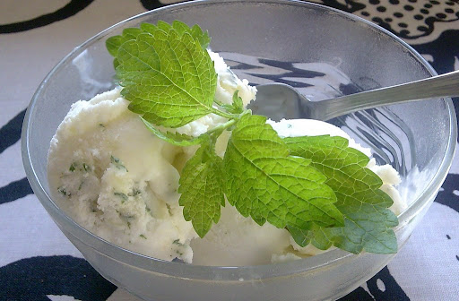Vot see jäätis mulle tõesti meeldib - ei mingit keetmist-jahutamist, munade vispeldamist ja muid aeganõudvaid toiminguid. Rasvase koore sisaldus on ka väike. Aga kui kena kreemjas ja värske maitse! Eriti rahul olen muidugi seetõttu, et retsepti mõtlesin täitsa ise välja! :cool: (Rohelised täpid jäätise sees on hakitud värske meliss.)