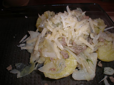 Kuna kapsa-hakklihahautisest jäi pisut järele, siis tegin täna hommikul Pille kapsapirukat. Päris originaalretseptist siis kõrvalekalle hakkliha näol, aga see andis mõnusa meki juurde. Väga kasulik pirukas, sain eelmise päeva jäägid ära kasutada :P. |
