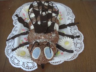 Mina tegin poja 10-ndaks sünnipäevaks Ämblikmehe tordi. Kihtideks 2 biskviiti, vahele kohupiima-vahukoore kreem ja maasikad. Biskviite immutasin sidrunimaitselise suhkuveega. Ämblikmehe kuju joonistasin martsipanile ja lõikasin välja. Ääred joonistasin sulatatud šokolaadiga üle ja seest värvisin toiduvärvidega. Maitses väga hästi. :)
