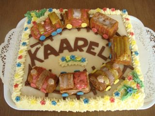Biskviitide vahele said maasikad, mustsõstrad ja kohupiim vahukoorega. Pealt on tort kaetud martsipaniga ja külgedel on vaniljekreemi- vahukoore segu. Rong on küpsetatud muffinitaignast ja kaunistatud suhkruglasuuriga. |