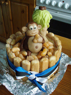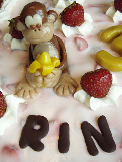 Tegin õele sünnipäevaks ahvitordi, kuna ta on ahvi aastal sündinud. "Laps" sai küll juba 18 aastat vanaks, aga arvan, et tort sobib siia teemasse küll. Servades ja põhjas biskviitküpsised, täidiseks banaanijogurtitarretis banaaniviilude ja šokolaaditükkidega. Ahv ja palm martsipanist, banaanikesed ahvi ümber on kummikommid. Lipuvärvides lint on seetõttu, et sünnipäev oli 24. veebruar. http://static2.nagi.ee/i/p/570/89/142723999026af_o.jpg/1