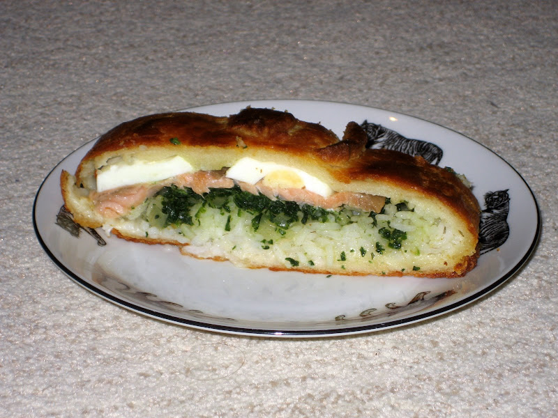 Ma ei saanud ju lasta kauem kesta olukorral, kus oli olemas kooskokkamine, milles ma osalenud polnud. :D Niisiis võtsin käsile lõhekulebjaaka küpsetamise. Retsept on enam-vähem "Suure küpsetamisraamatu" 2. osast, vajalike asendustega (lehttaina asemel pärmilehttainas, värske lõhe asemel suitsulõhe jm).