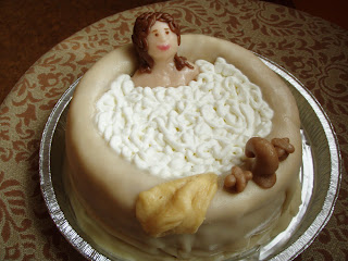 (Ma tahtsin torti ka teha, aga üks tädidest - ehk vanaema kolmas tütar neljast tütrest - on ametilt kokk ning tema teeb klassikalise pidulaua, kus on täidetud munad, pasteedipallid, tainas praetud kalatükid ja kanatükid ja erinevad salatid ning suur vahukoore-puuviljatort.).