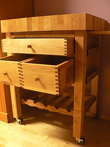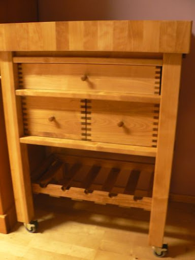 Peaaegu aasta möödas ja mina olen õnnelik Kokalaua omanik. Täitsa värske, täna "kodustatud". Pean tunnistama, et antud lehel toodud mudelitest on see veidi erinev ehk siis seal lehel sellist mudelit ei olegi. Peal on tal mõnusalt paks ristikiudu liimpuidust tugev plaat, selle all väljatõmmatav (lõike)laud, edasi selle all 1 lai sahtel ja 2 kõrgemat sahtlit ning pudeliriiul. Külje peal on käterätihoidja ning tagaseinas (veel kinnitamata) nugadehoidja. Laud on õlitatud.