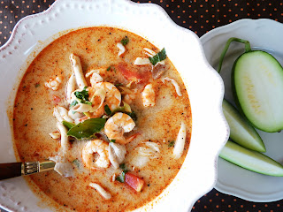 Inspireerituna Juci kiidulaulust Tom Yumile ja leidnud poest Santa Maria Tom Kha supisegu, tegin Tom Khad pakil oleva õpetuse järgi. Pole varem kummagi supiga kokku puutunud, aga mulle tom kha väga maitses. Võib vaid ette kujutada, kuidas see värskete asjadega tehes on.