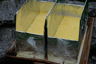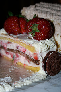 Küpsetasin kolm biskviiti, kaks heledat ja ühe tumeda keskmiseks kihiks. Kastide jaoks meisterdasin papist vormid, mille katsin hõbepaberiga. Tordi vahele panin kreemi, mis koosnes metsmaasikajogurtist, vahukoorest, maasikaviiludest ja sidrunimelissist. Pealt katsin kohupiima-vahukoorekreemiga ja kaunistasin vahukoorega. Kabiini osa kaunistasin kakaoga värvitud vahukoorega.