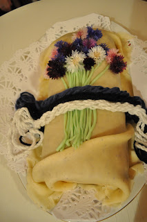 Osalen esimest korda sellisel toredal tordivõistlusel. Tort on valminud tellimustööna. Tort on siis kokku pandud järgmisena: Muretaignapõhi kaetud jõhvika toormoosiga , mis ühendatud biskviidiga. Vahekreemiks kasutasin kohupiima-vahukoore kreemi millesse lisatud ohtralt purustatud ja ka osa neist purustamata jõhvikaid. Kreemi pealispind kaetud taas biskviidiga, millele määritud õhuke kiht võikreemi ja see kaetud heleda martsimaniga. Lilled kaunistuseks valmistasin valgest martsipanist, mida siis vastavalt lillede omapärale toonisin - rukkililled siniseks , viljapeadele andsin tooni karamellistatud suhkruga jne.. Tordi pinnale õrna joonise tegemisel kasutasin valget šokolaadi , millest ka mõned kaunistused lillede vahel. Mõned kaunistused viljapeade juures ka suhkrukaramellist. Kuna tort tellimustööna ja suurüritusele, kus külalisi 600 ringis, siis tort 60 kg ja valmistatud kolme osalisena, kohapeal kokkupandavana täpselt jälgituna lipuvärvides lindi ja muu kaunistuse kokkujooksu.