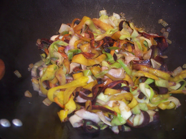 Lõika sibul väikesteks tükkideks. Koori porgandid ja suvikõrvitsat (zucchini), koorimisnoaga koori poragandi ja suvikõrvitsa viljad laiali, et lõpuks tuleks pikad aedvilja "nuudlid". Pane sibulatükid wokipannile praadima, lisa paari minuti pärast porgand, hiljem suvikõrvits. Kui aedviljad on pehmeks saanud, siis lisa lihatükid (krevetid). Sellel ajal pane hiina nuudlid keetma 3min (aeg sõltub nuudlitest), kui nad on valmis, lisa woki. Maitseta soola ja pipraga, vala soojakaste woki peale ning lase 1-2 min praadida.