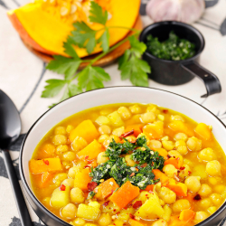 Maroko kõrvitsa-kikerhernesupp spinatiga
