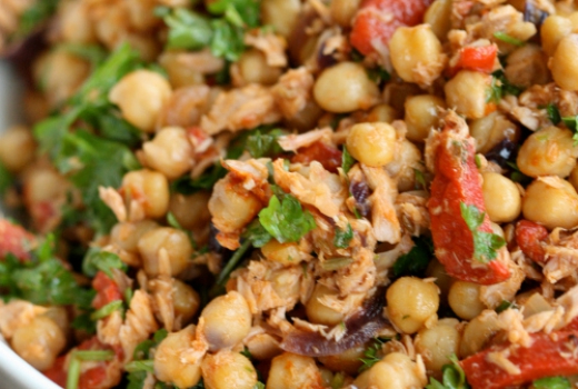 Soe kikerherne-chorizo salat röstitud paprikaga