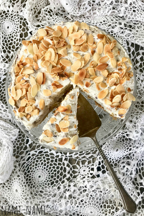 Serveerimisel tõsta kook alusele ning kaunista röstitud mandlilaastudega.