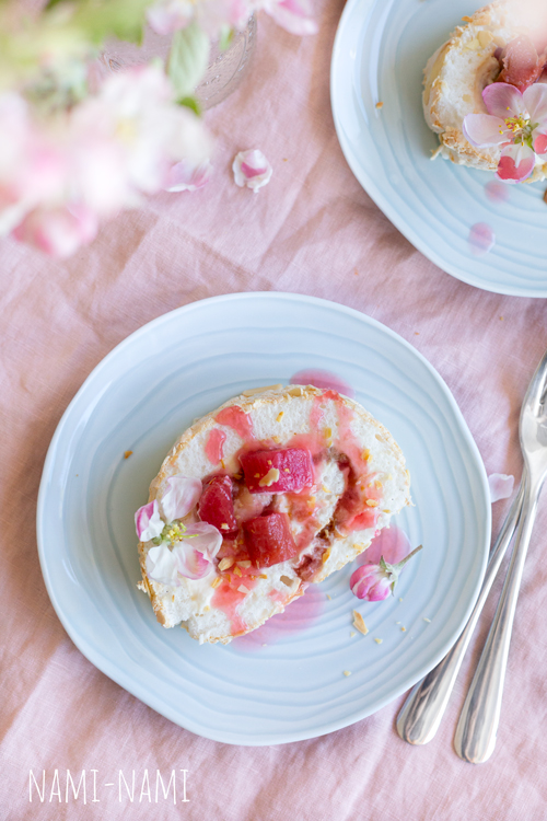 Vahukommise beseerulli sees on roosiveega maitsestatud vahukoor ja hapukas rabarber.