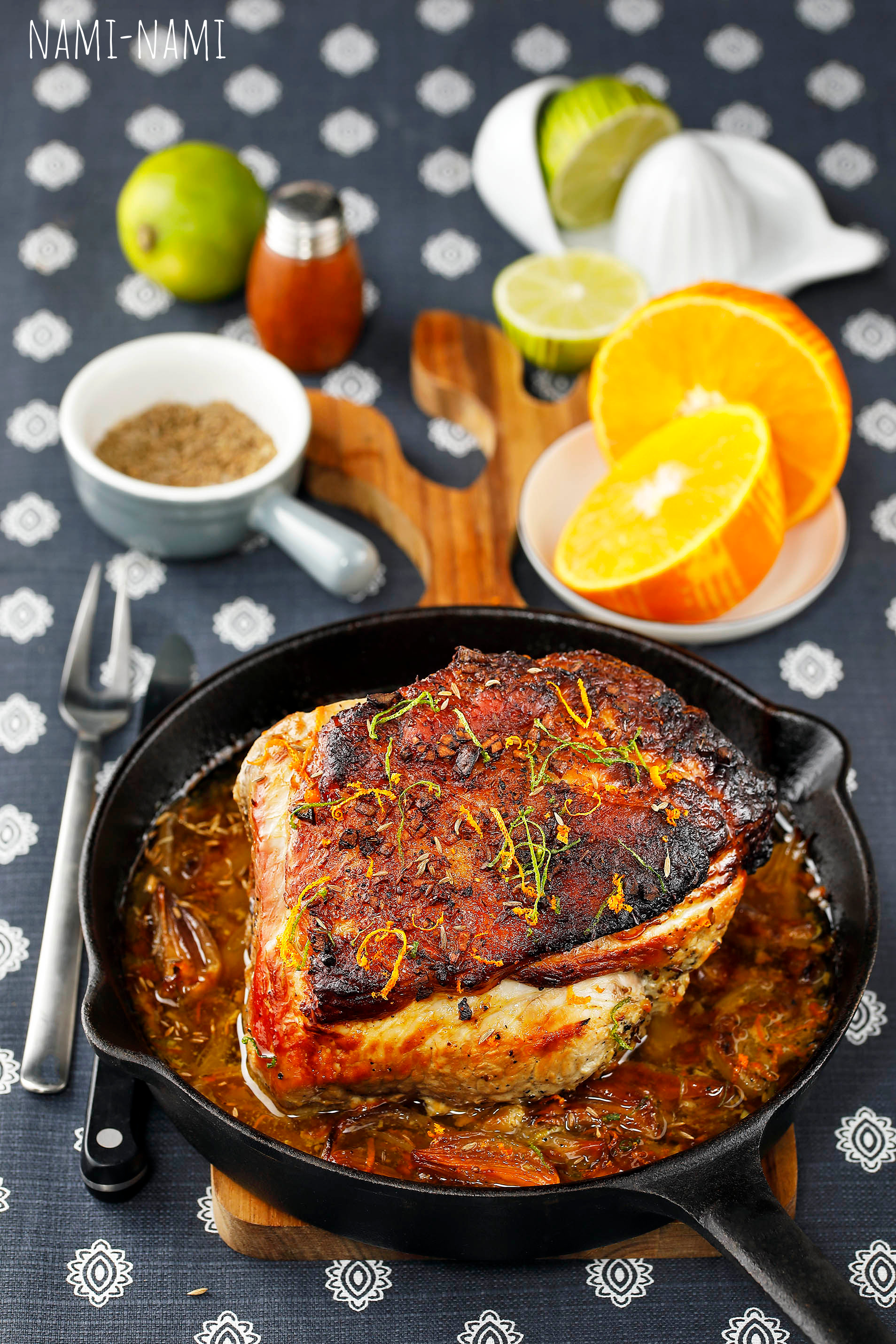 Marinaadi jaoks sega peenelt riivitud laimikoor, peenelt hakitud küüslauk, vürtsköömned, sool ja veidi musta pipart. Hõõru saadud segu lihasse. Pane liha paraja suurusega nõusse, laota ümberringi viilutatud sibulad. Kalla peale apelsinimahl ja laimimahl.