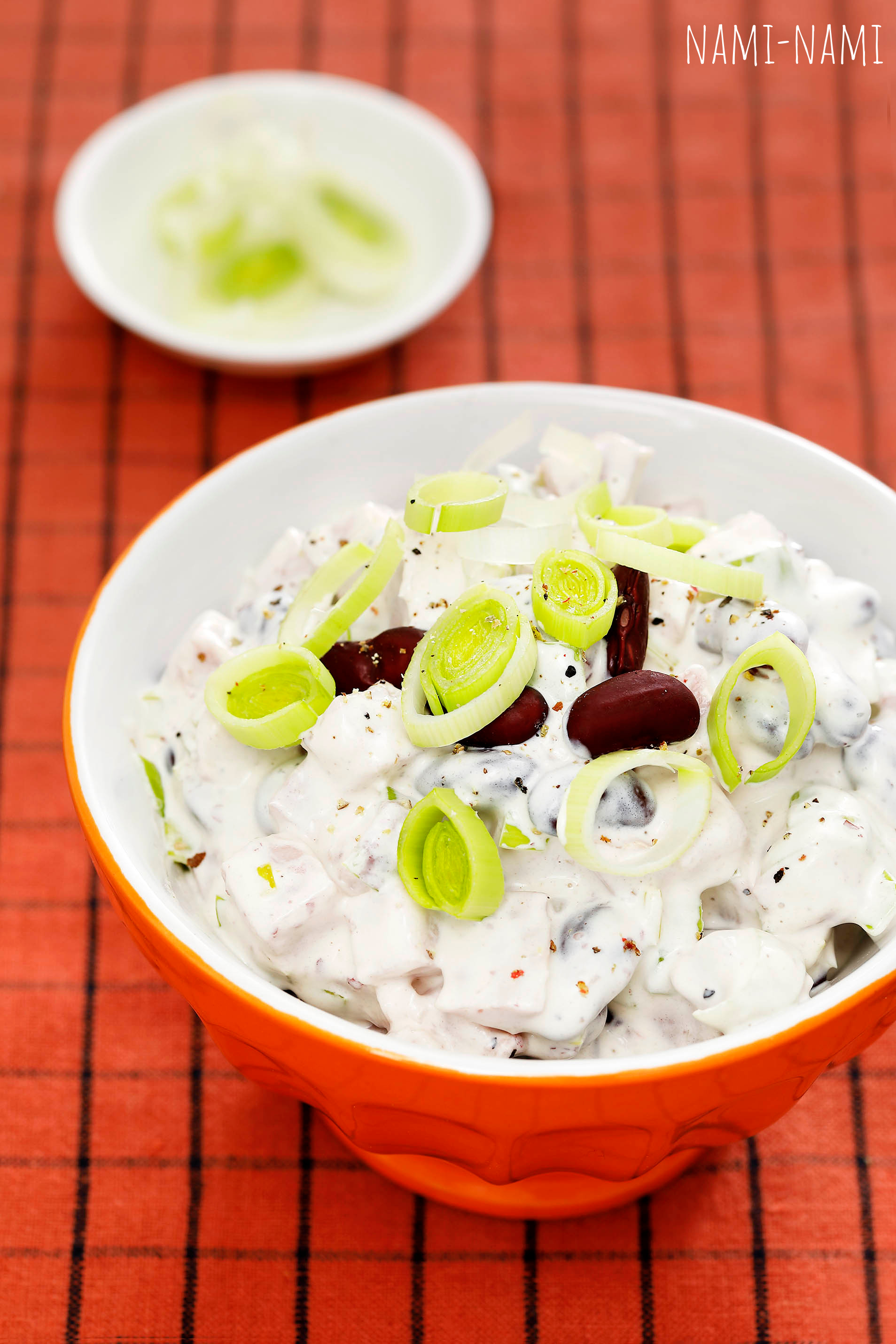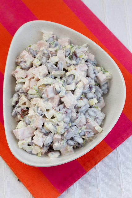 Lihtne majoneeskastmega salat, mis sisaldab sinki, konservitud ube ja porrut. Valmib imekiiresti!