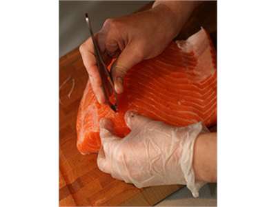 Lõika forellifilee neljaks tükiks, à 150 grammi.