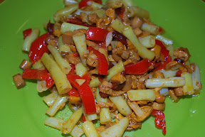 Kummuta pannil õli. Küpseta seeni mõni minut, kuni seentest eraldunud vedelik on peaaegu aurunud. Siis lisa pannile oad ja paprikad, kuumuta veidi.