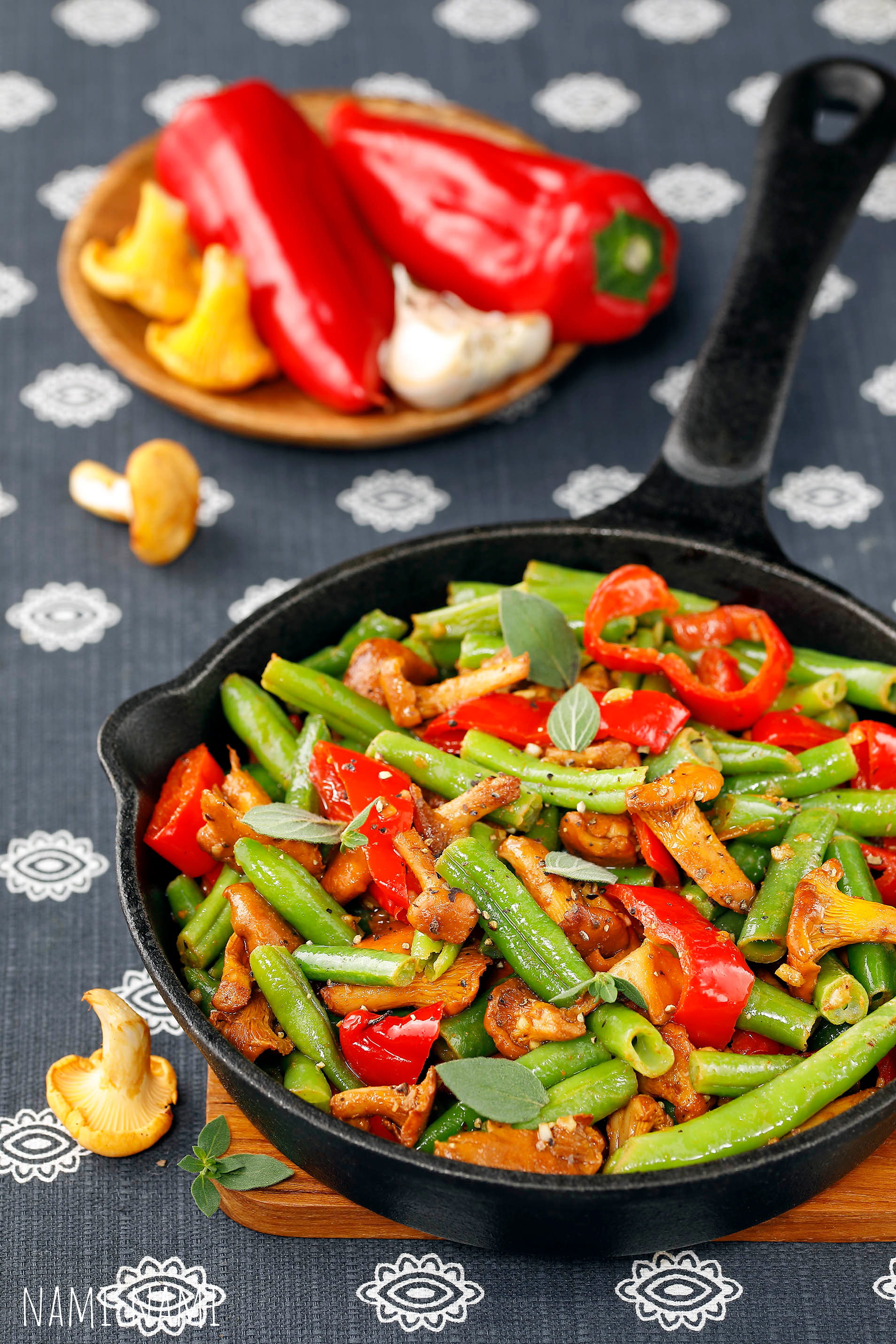 Pese paprikad, eemalda seemned ja lõika viljaliha ribadeks. Eemalda oakaunadelt puitunud osad ja lõika kaunad tükkideks. Pese ja puhasta kukeseened.