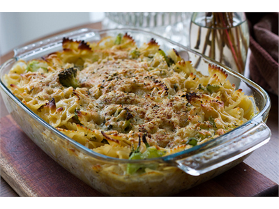 Sinepiga maitsestatud spargelkapsa- ehk brokoli-makaronivorm, mida katab mõnusalt krõbe juustukate.