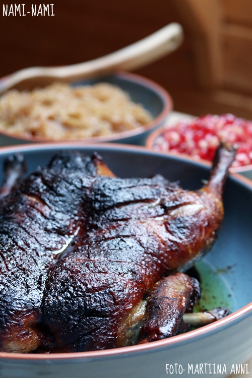 Tõsta ahi toatemperatuurile soojenema 30 minutiks, siis pane ahjuplaadile ning küpseta 170-kraadises ahjus 3-3,5 tundi. Kui nahk hakkab liialt pruuniks muutuma, siis kata lind fooliumiga.