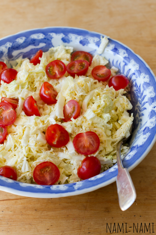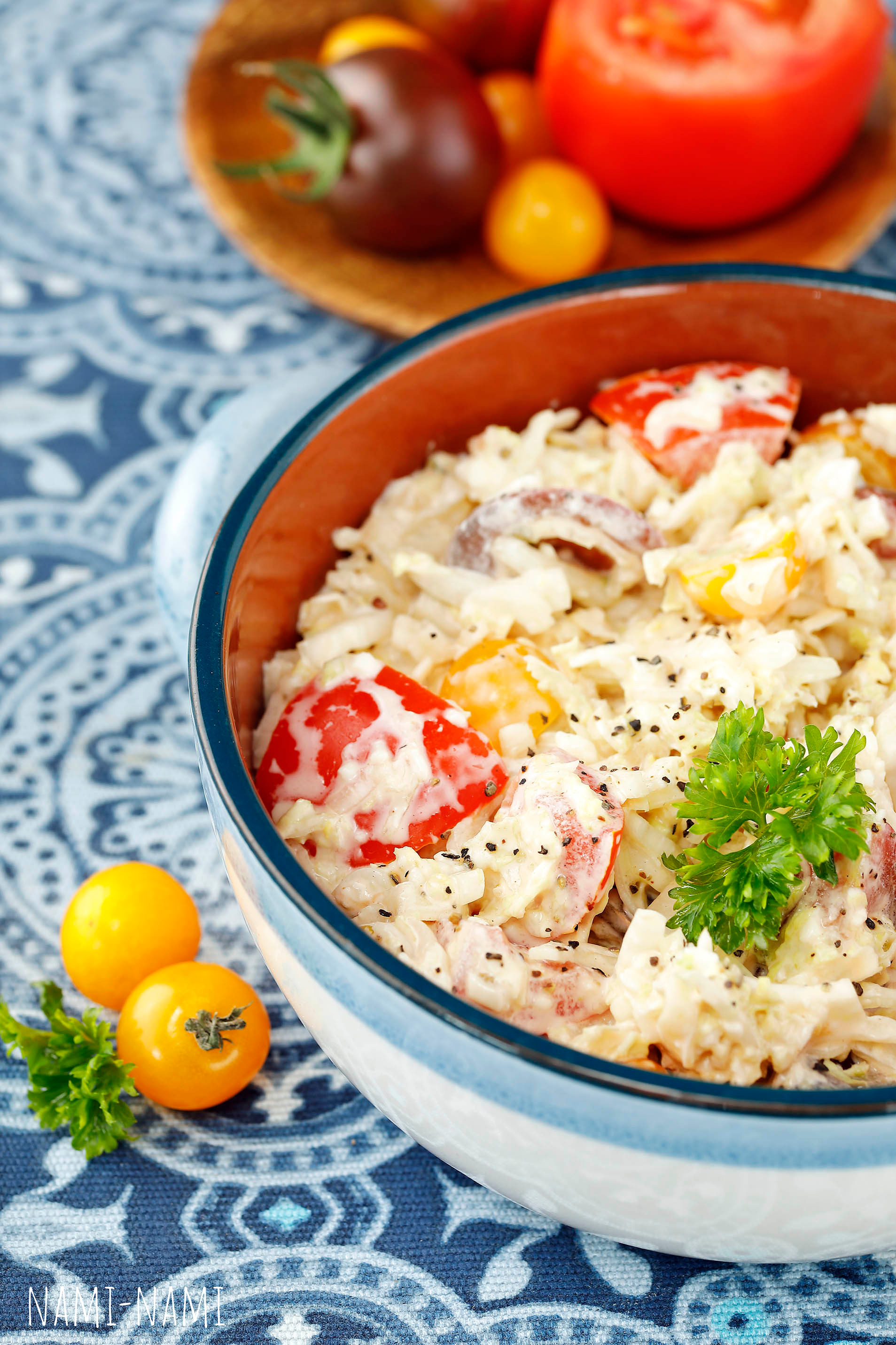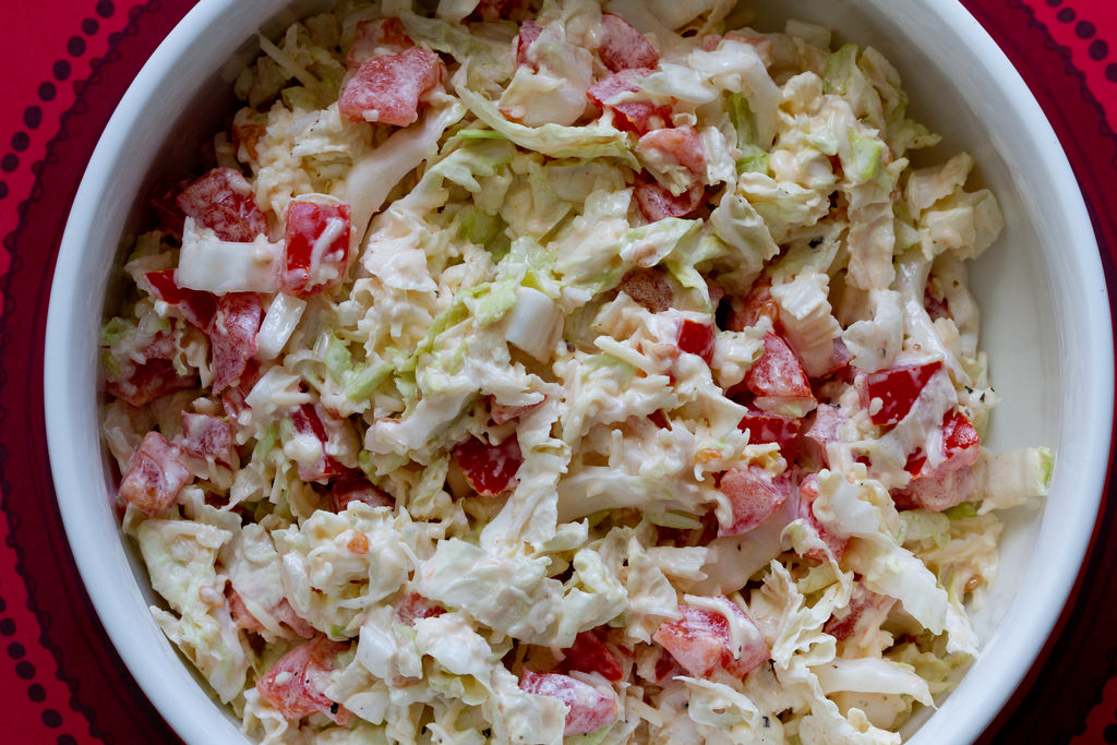 Sega kapsas, tomat ja juust majoneesiga. Maitsesta soola-pipraga ja serveeri kohe.