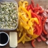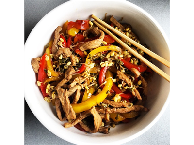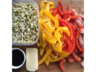 Lõika sealiha peenikesteks ribadeks. Aseta taldrikule, nirista peale sojakaste* ning lase jahedas umbes tund aega maitsestuda. (Kui selleks aega pole, siis kalla sojakaste lihtsalt pannile koos paprikaribadega).