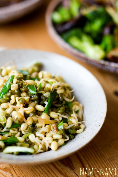 Kuumuta vokkpann hästi tuliseks. Lisa õli ja kuumuta. Lisa talisibula valge osa, sega läbi. Siis lisa ingver ja seejärel idandid. Kuumuta pidevalt segades 2-3 minutit, kuni idandid on soojad. Lisa näpuotsatäis soola ja roheline sibul.