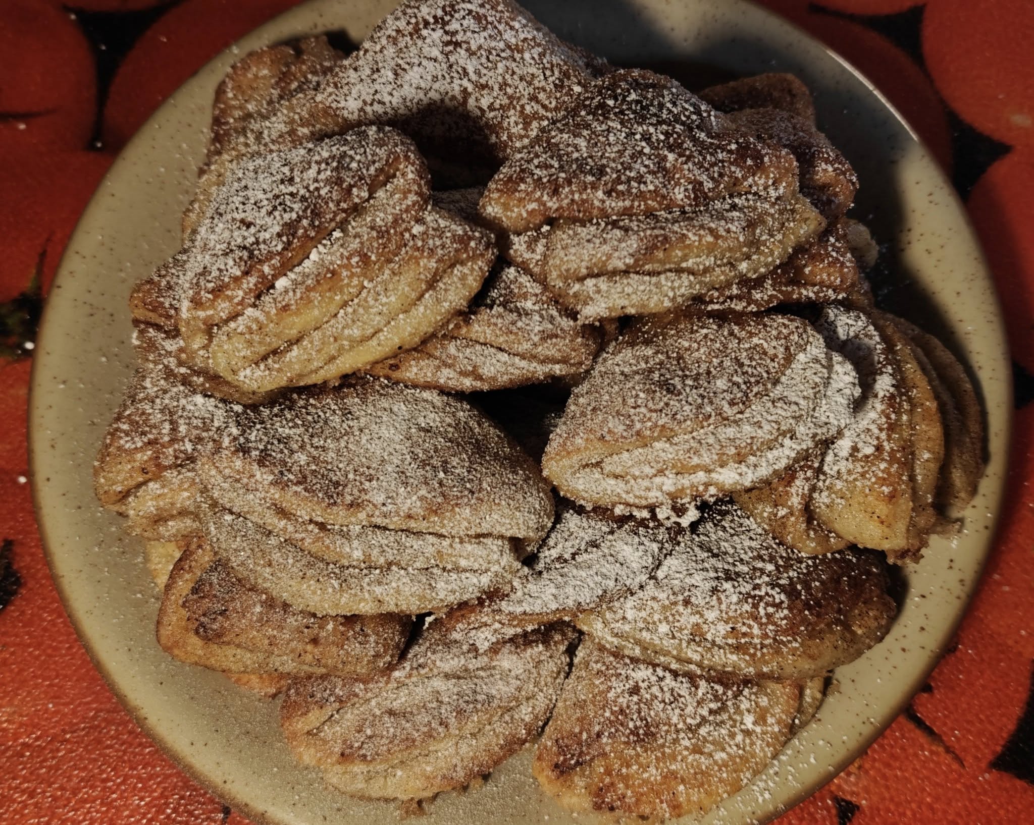Kalla (kaneeli)suhkur väikesele alustassile. Võta üks tainaketas, suru mõlemad pooled kergelt suhkrusse. Murra tainaketas seejärel pooleks ja siis veel pooleks, nii et saad "kolmnurga". Tõsta (küpsetuspaberiga kaetud) ahjuplaadile.