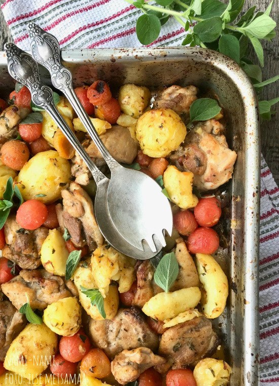 See tundus nii isuäratav, et tegin täna perele õhtusöögiks. Kirsstomatid koorisin ära, kartulid olid tavalised suured "Laura" omad - need koorisin, lõikasin neljaks ja siis keetsin eelnevalt. Kasutasin kanakintsutükke, lõikasin need kaheks. Pune oli värske ja oma aiast.