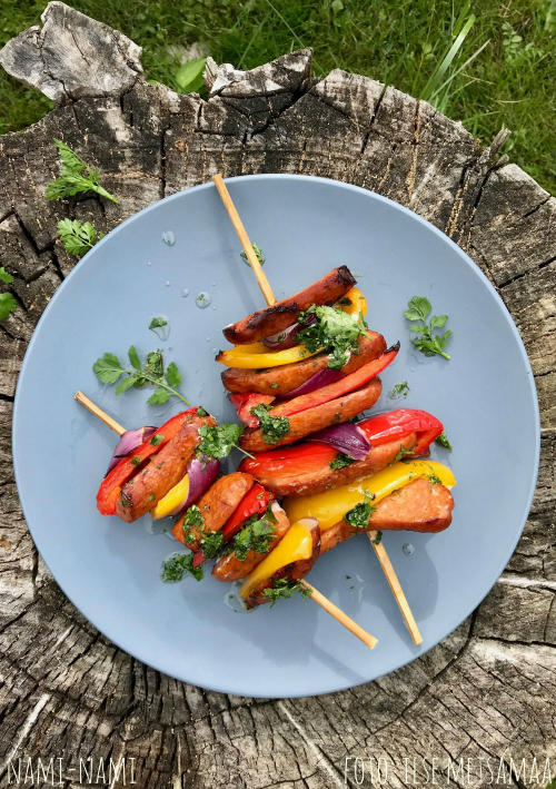 Lüki vorstid ja köögiviljad puitvarraste otsa, pintselda kergelt õliga. Küpseta köögivilja-vorstivardaid u 10 minutit neid aeg-ajalt pöörates, kuni vorstid on jumekad ja köögiviljad küpsed.