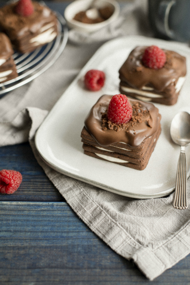 Kasta küpsis kohvisse ja tõsta küpsetuspaberiga kaetud alusele. Lisa u 1 tl hapukooresegu, seejärel jälle kohvisegusse kastetud küpsis. Lao kokku neli kihti küpsiseid ja hapukooresegu.