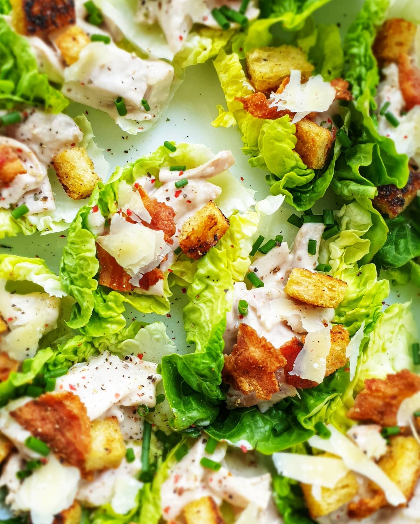 Jaota kanasegu salatilehtedest "korvidesse". Tõsta igale portsjonile paar krutooni, 1-2 peekonitükikest ning juustulaastuke. Kaunista hakitud murulauguga ja serveeri.