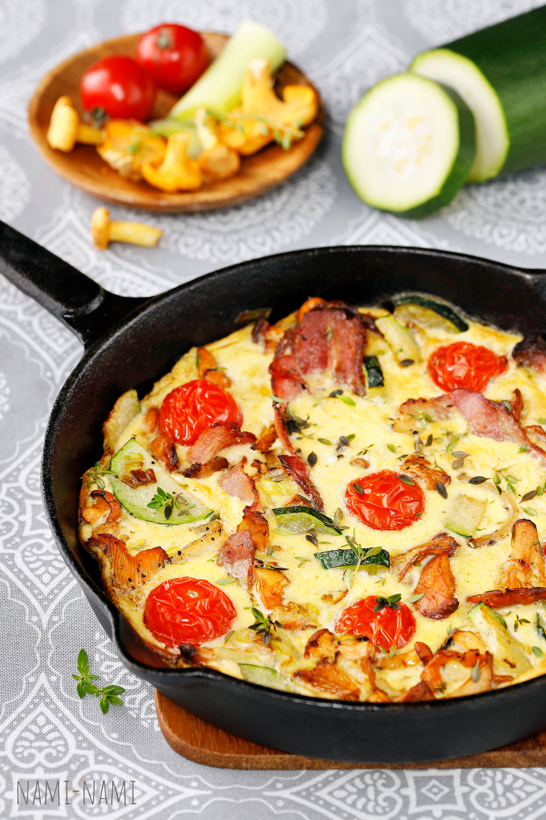 Kuumuta pannile jäänud rasvas puhastatud (ja vajadusel tükeldatud) seeni ning viilutatud porrut ning tüümiani umbes 5 minutit, kuni porru on pehmenenud ja seened kergelt pruunistunud. Lisa tükeldatud suvikõrvits ning poolitatud kirsstomatid. Kuumuta veel paar minutit.