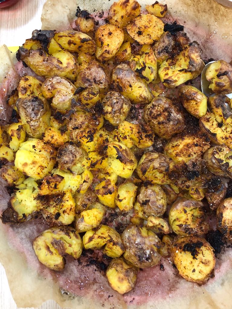 Pane õli ja või suurele ahjupannile. Pane 3 minutiks ahju, et või sulaks. Siis võta ahjust välja, lisa nõrutatud kartulid ja raputa panni, et kartulid oleksid või-õliseguga koos. Seejärel võta pudrunui ja vajuta kartulid kergelt katki/lapikuks.