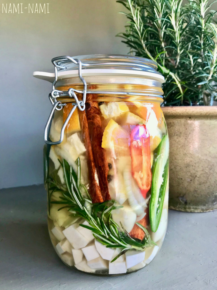 Pane ingver ja mädarõigas 1-liitrisse kaanega purgi põhja. Lisa muljutud küüslauguküüned, rosmariinioksad, pikuti poolitatud tšillid, pipraterad, kaneelikoored ja sibulaviilud. Lisa sidruni- ja apelsinitükid ja suru komponendid tugevasti kokku.