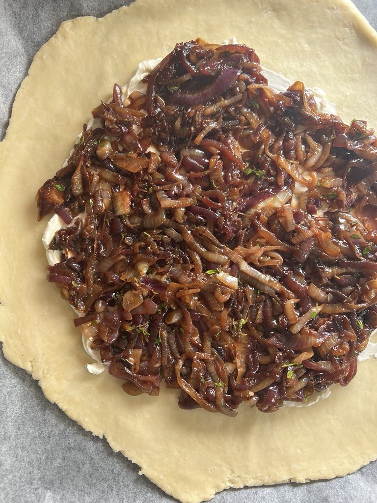 Määri tainaplaadi keskele toorjuust, jättes serva u 6 cm laiuselt puhtaks. Laota toorjuustule sibulasegu, siis tõsta servad üle täidise. Pintselda tainaservad munaga, puista peale veidi seesamiseemneid.