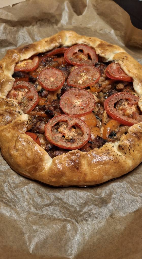 Galett, täidiseks praejäägid, seened ja paprika. Taigna retsept siit. Väga maitsev ja lihtne taigen.