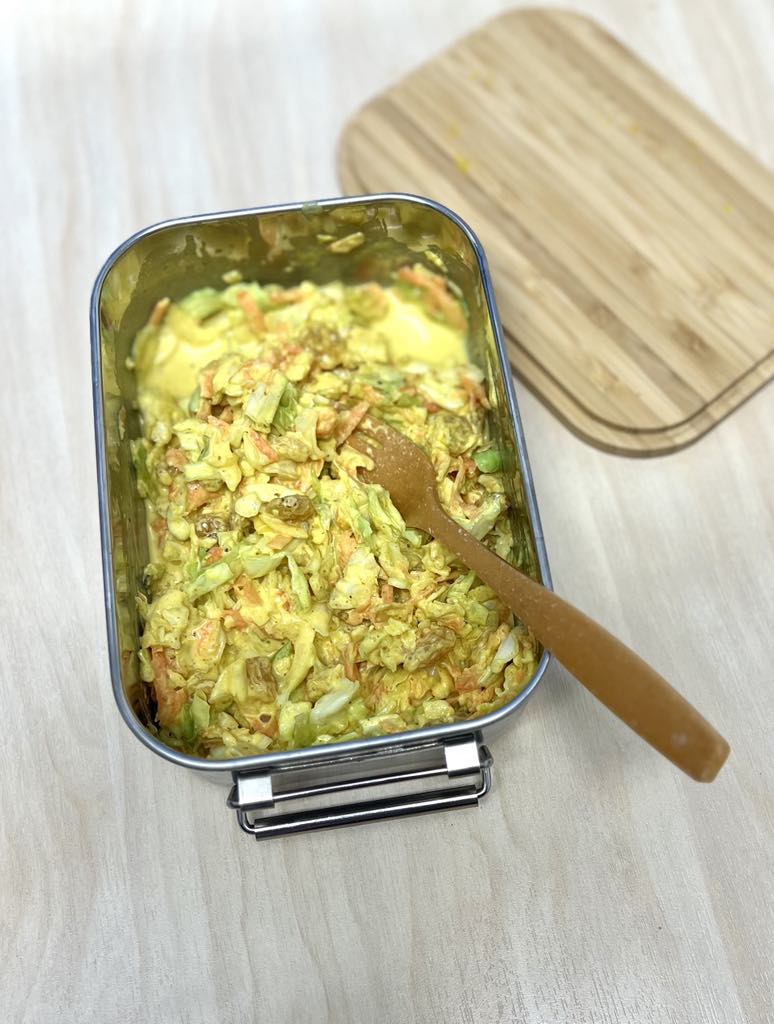 Serveeri karriga maitsestatud kapsa-porgandisalatit lisandina külmade lihalõikude juurde või võileivakattena. Rosinad ja karripulber lisavad siia brittide armastatud "coronation chicken" hõngu.