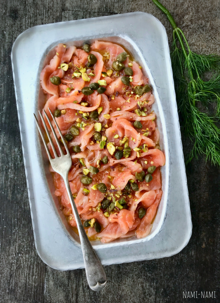 Lõika kalafilee terava fileerimisnoa abil võimalikult ühtlasteks õhukesteks viiludeks ning säti viilud sügavale vaagnale. Pigista sidrunist peale mahl, puista peale kapparid ja pistaatsiapähklid. Kõige peale nirista oliiviõli.