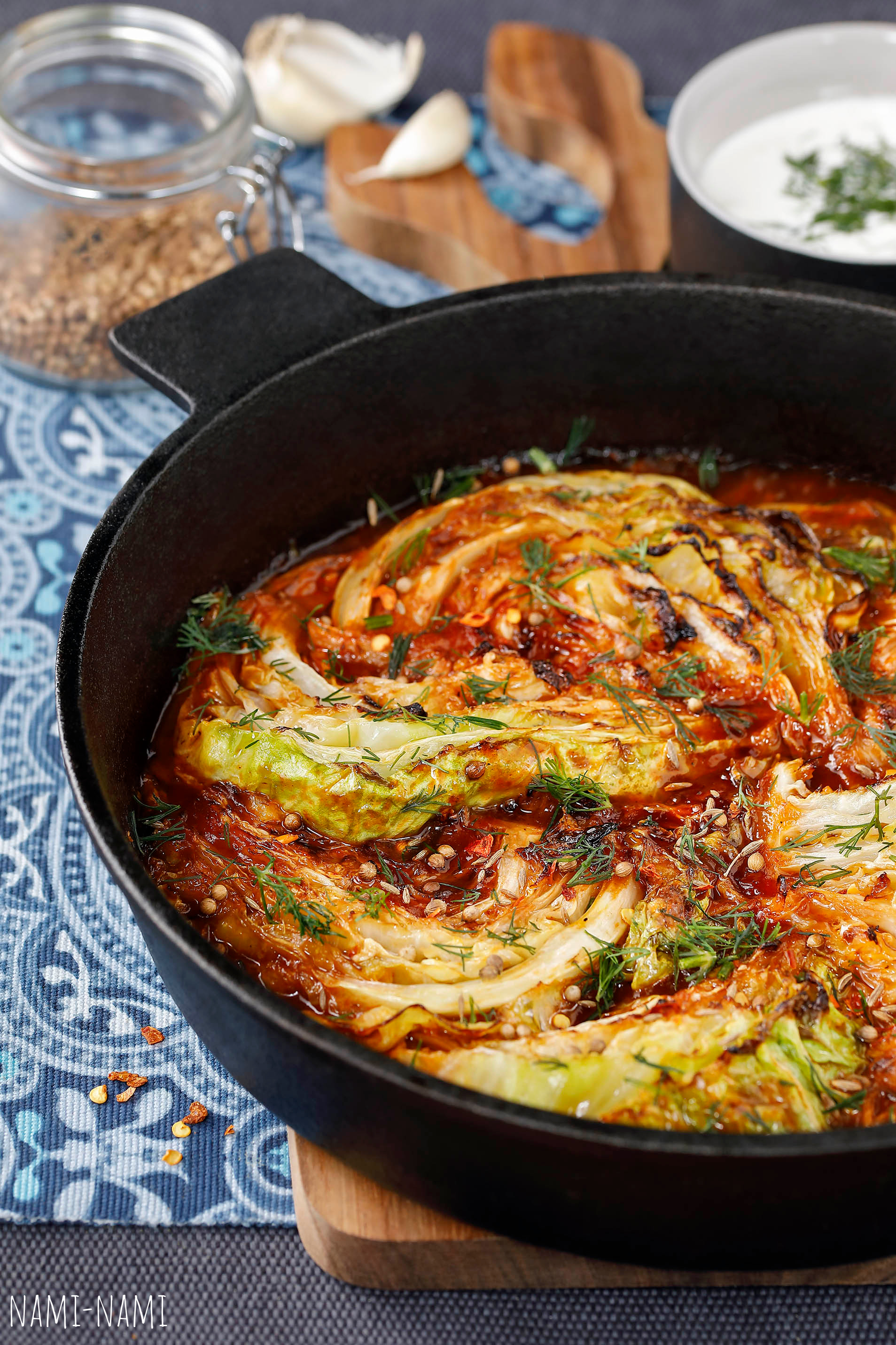 Tõsta 170-kraadisesse ahju ning küpseta 40-50 minutit või kuni kapsas on täiesti pehme, vedelik on aurustunud ja kapsasektorid on servadest karamelliseerunud.