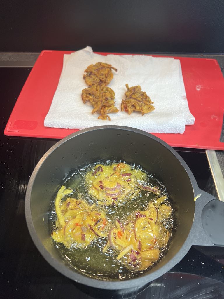 Sõelu jahu ja küpsetuspulber kaussi, lisa karripulber või -pasta, hakitud tšilli ja soola. Lisa u 150 ml külma vett, et saad paksu taina. Sega juurde hakitud ja viilutatud sibul.