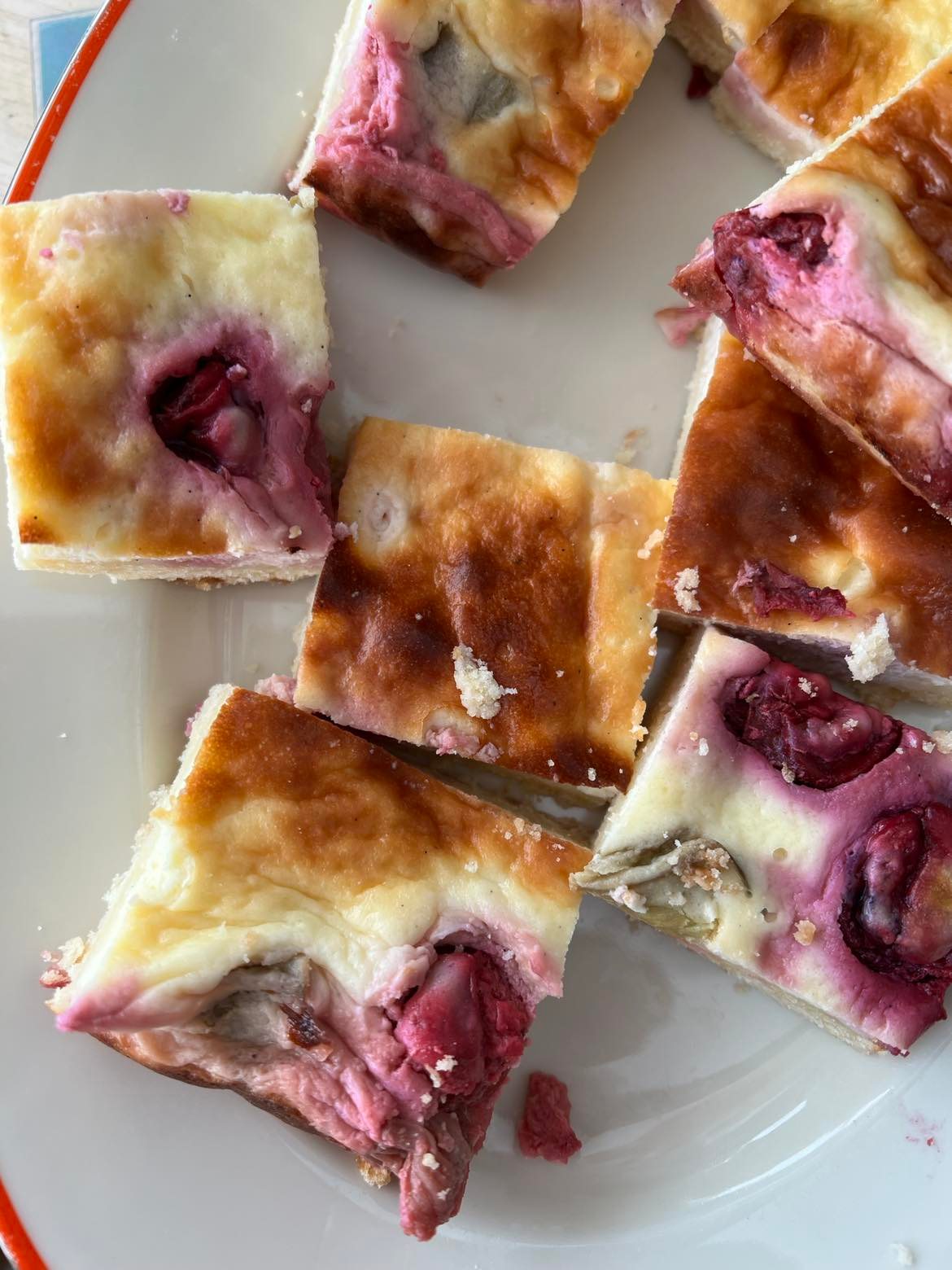 Paksu liivatainakihi ja kohupiimaga plaadikook. Siin kirssidega variant, aga marjade lisamine pole üldse kohustuslik.