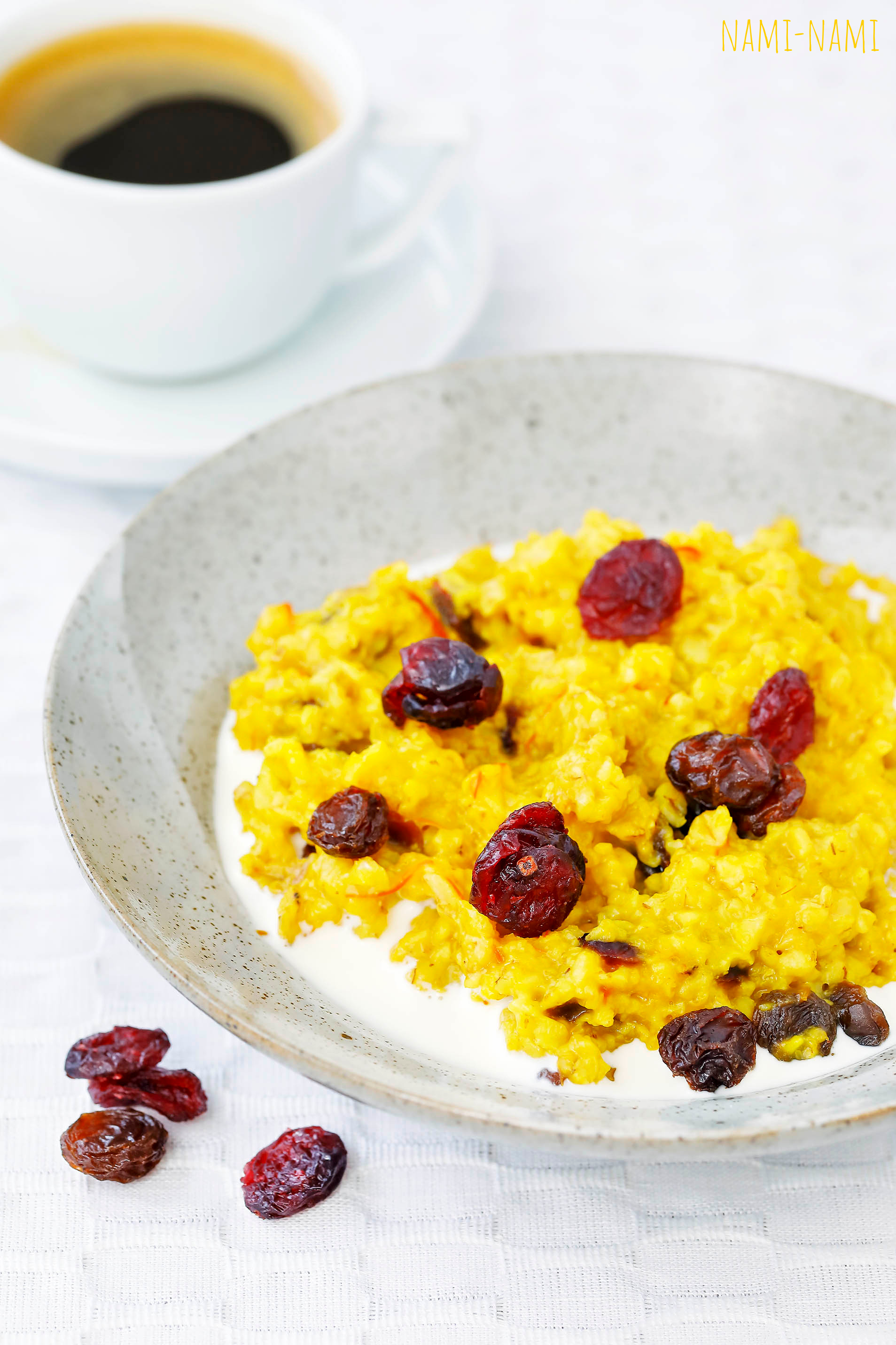 Rootslaste lussekatter-safranisaiakestest inspireeritud kuldne hommikupuder.