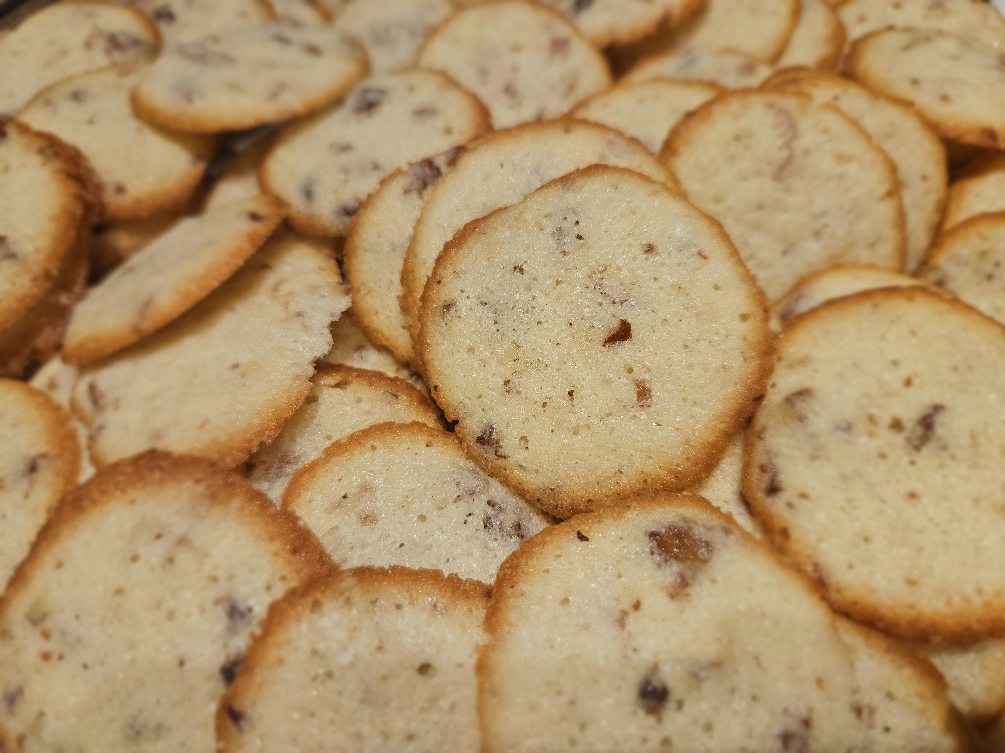 Hoiatan ette, et kui pole kavas kogu külale õhtul küpsiseid pakkuda, siis võiks kogust vähendada vähemalt poole võrra. Minul tuli sellest kogusest neli plaaditäit küpsiseid ning taldrikule asetades oli seda kõrge virn. Ma vähendaksin retseptis olevat suhkrugkogust u 100 grammi võrra. Aga kokkuvõttes on need küpsised väga hea võimalus ära kasutada munavalgeid ning mõnus krõbe suutäis mitmeks õhtuks (mulle tundus, et seistes muutusid need veel paremaks).
