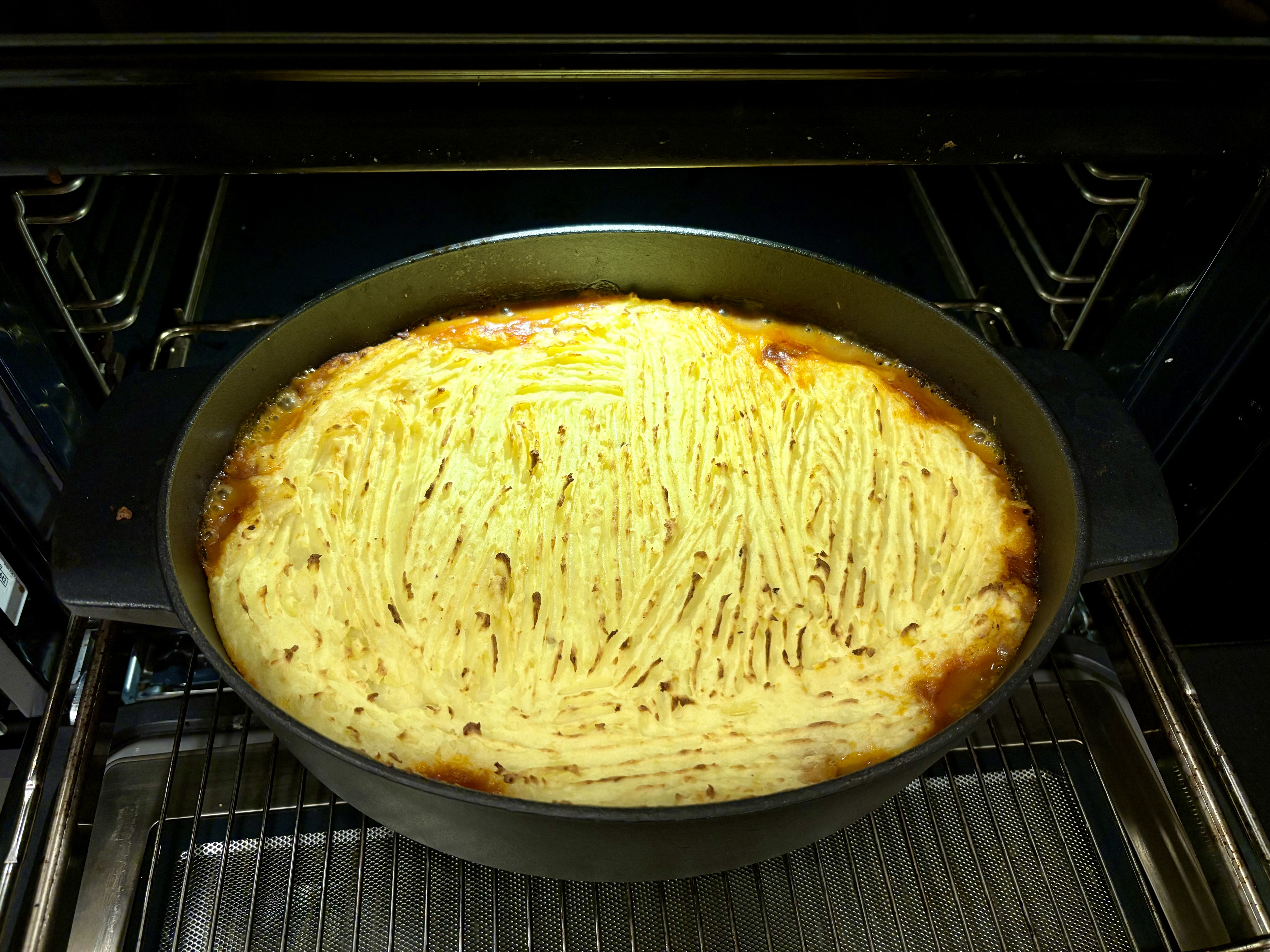 Kalla hakklihakaste ahjuvormi, laota peale kartulipuder. Tee kahvliharudega siiruviiruline muster peale.