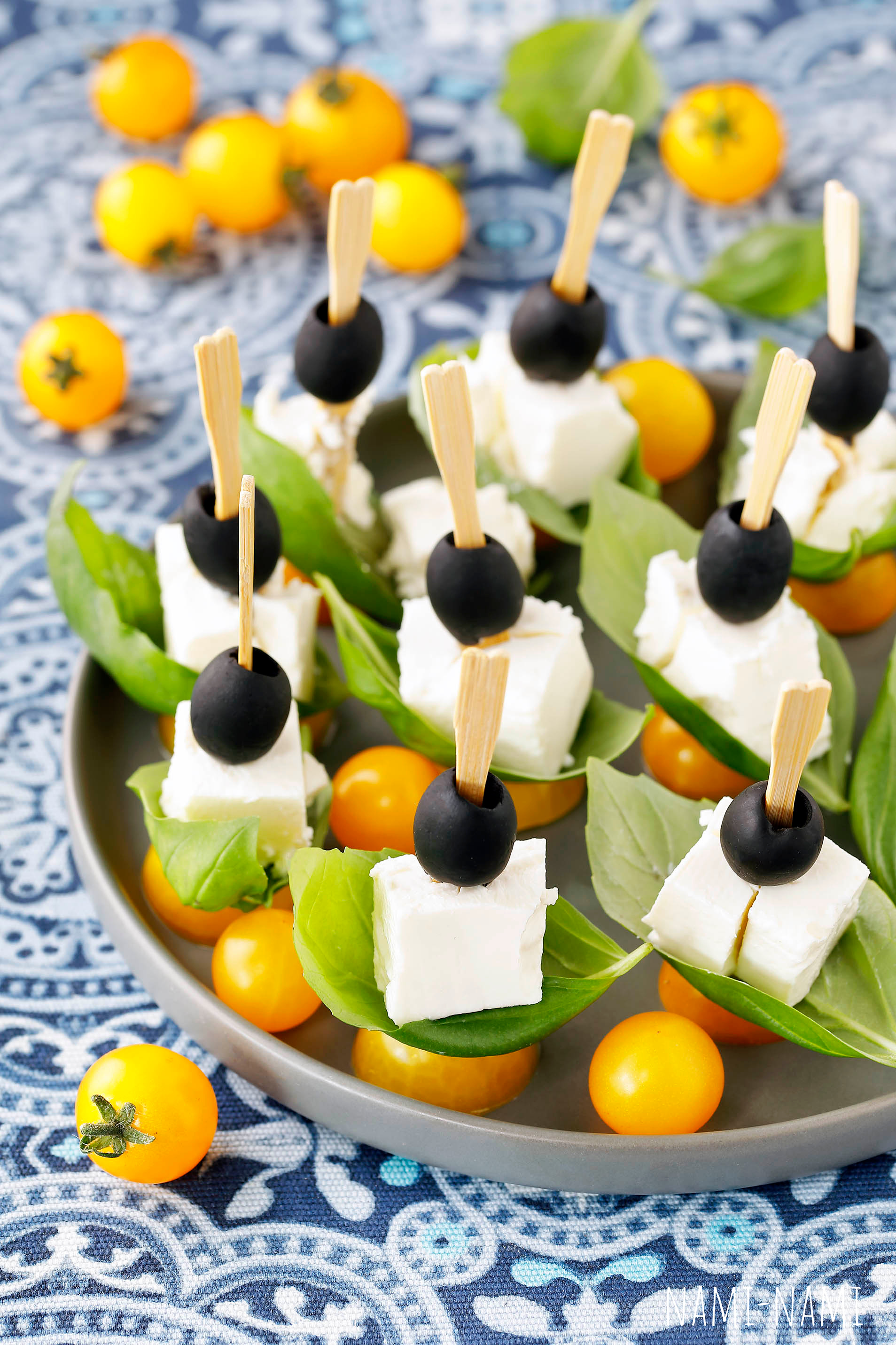 Pane tomatipoolikule basiilikuleht, sellele fetajuustukuubik ja kõige peale must oliiv.