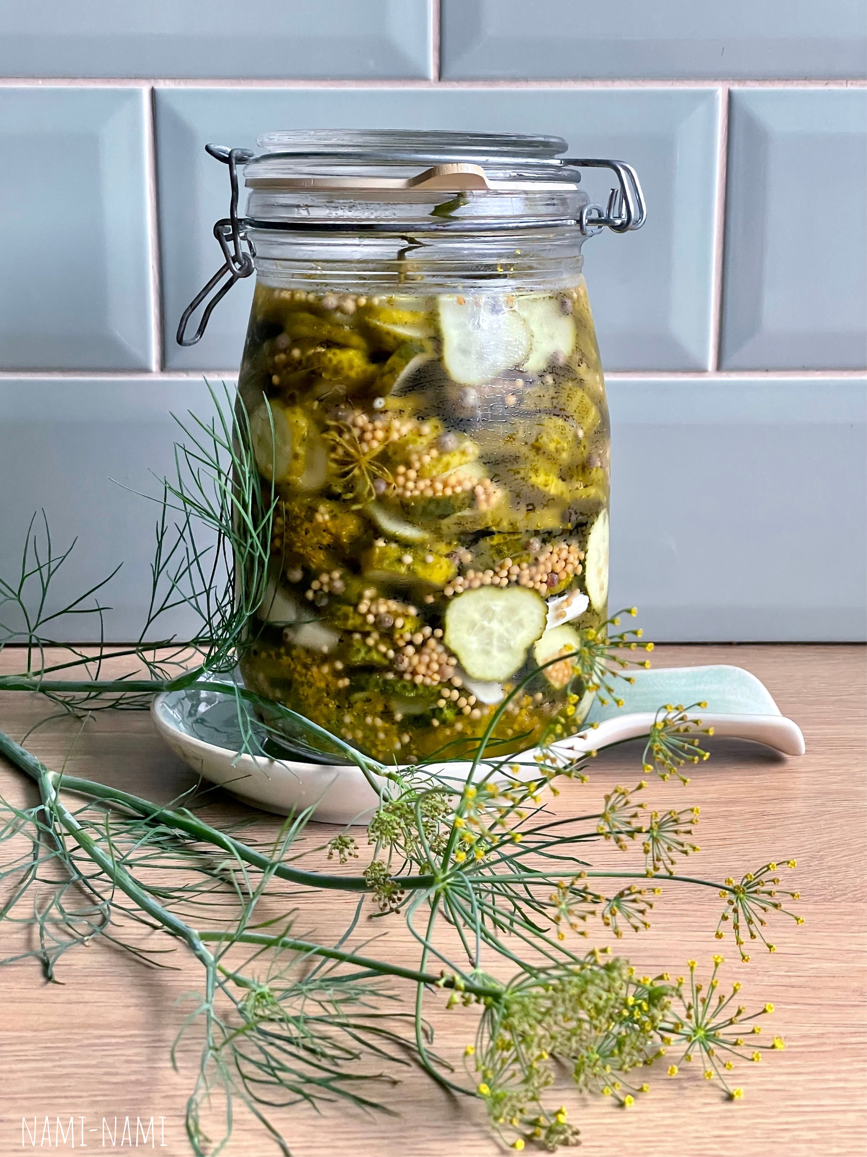 Lõika kurgid viiludeks, pane purki vaheldumisi tilliõisikute, mädarõika, sinepiseemnete ja valge pipra teradega.