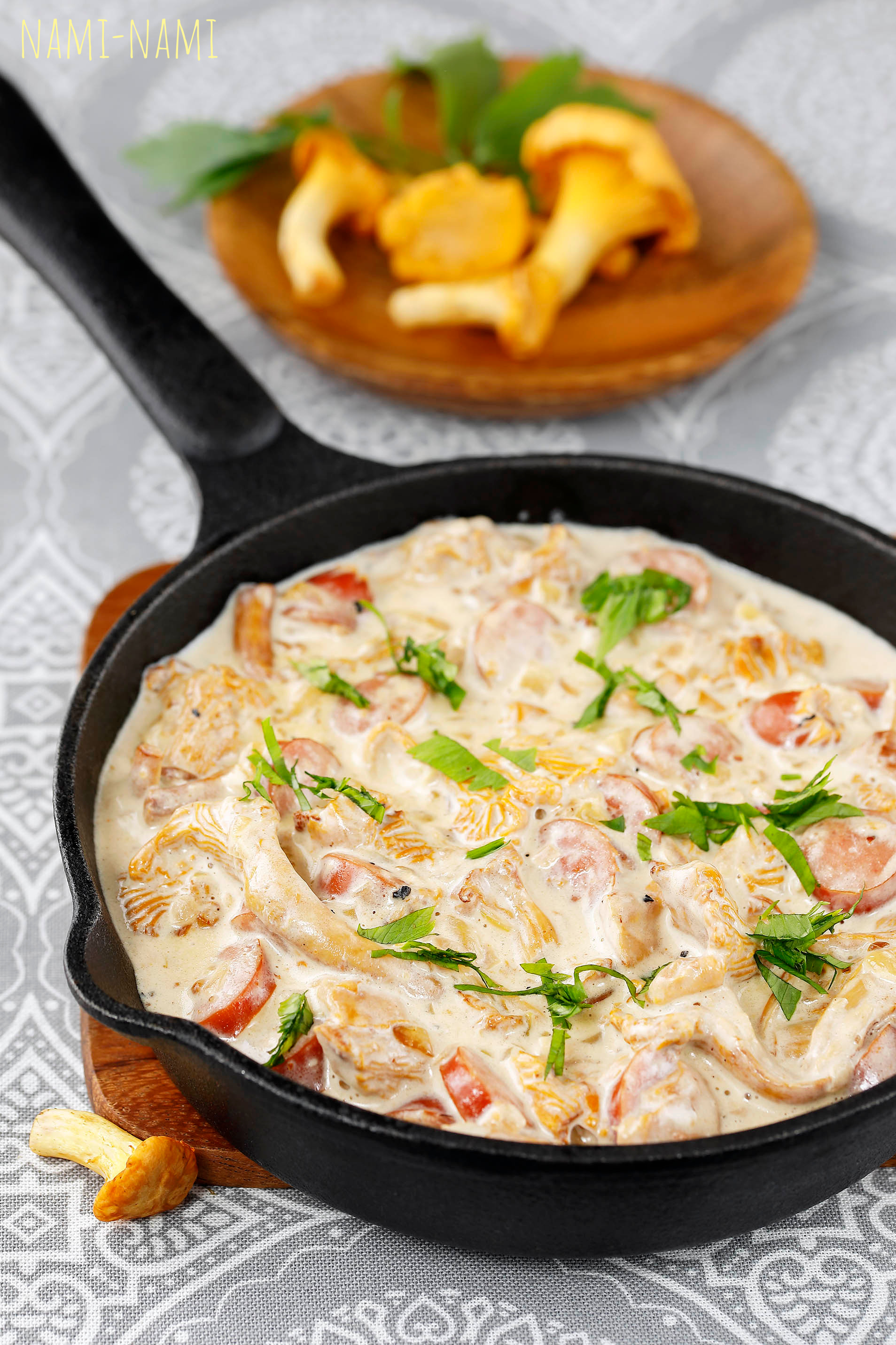 Sulata kuumal pannil või ja küpseta selles hakitud kukeseened, peeneks lõigatud viinerid ning peenestatud sibul.