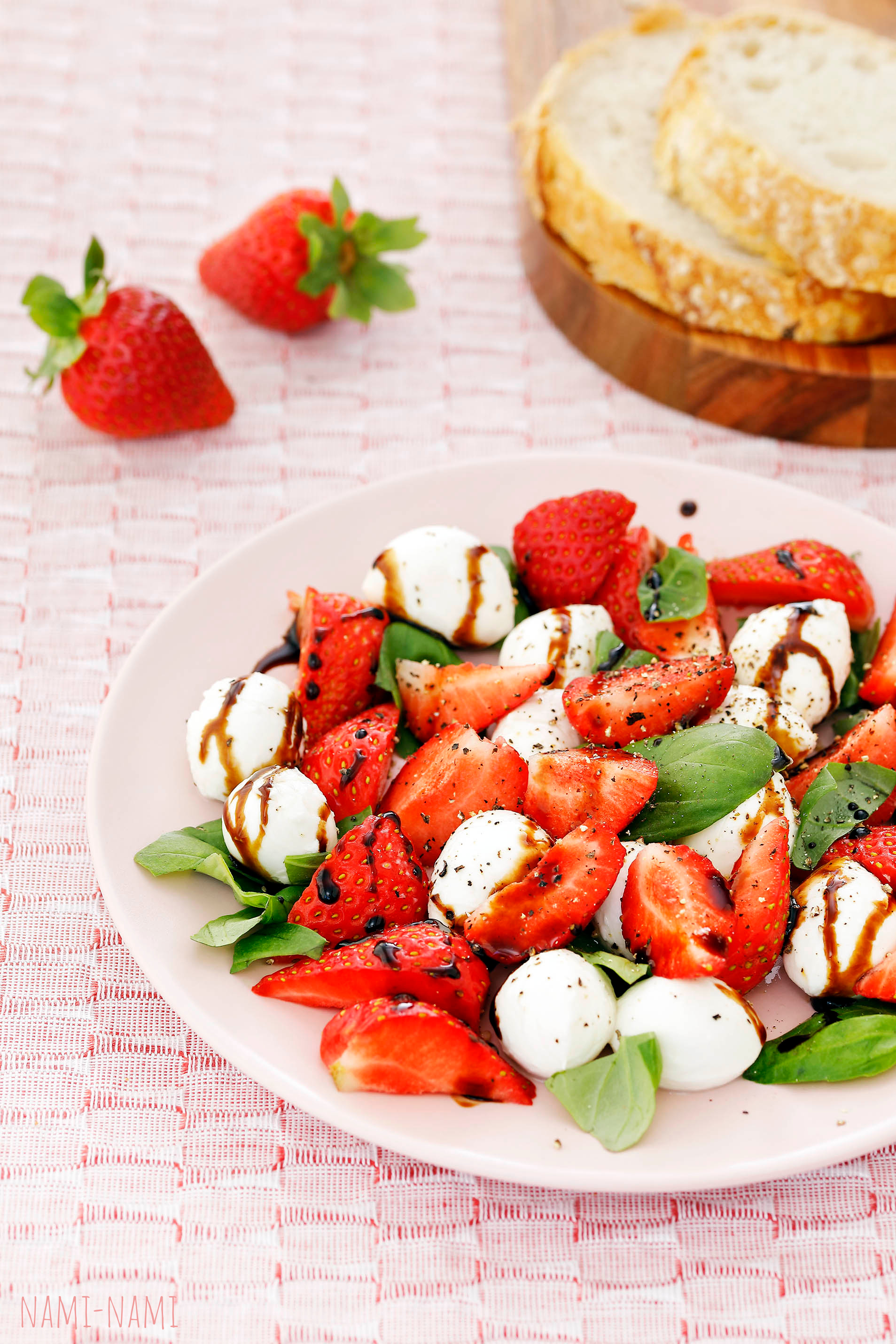 Lõika mozzarella õhukesteks viiludeks. Puhasta maasikad, lõika viiludeks. Laota mõlemad suurele vaagnale vaheldumisi.