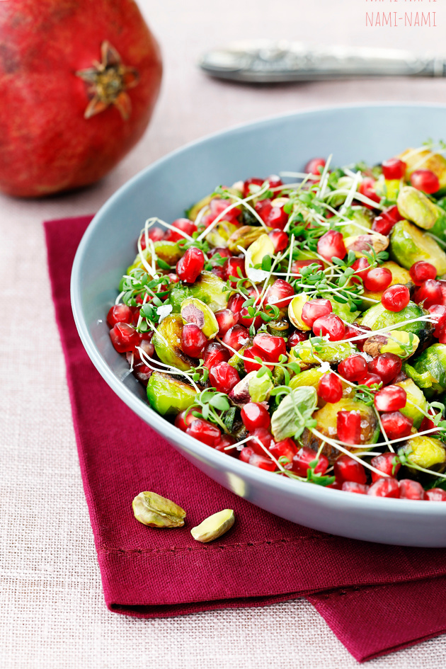 Siis tõsta pann tulelt, sega juurde granaatõunaseemned. Maitsesta soolaga, tõsta serveerimiskaussi või -vaagnale.