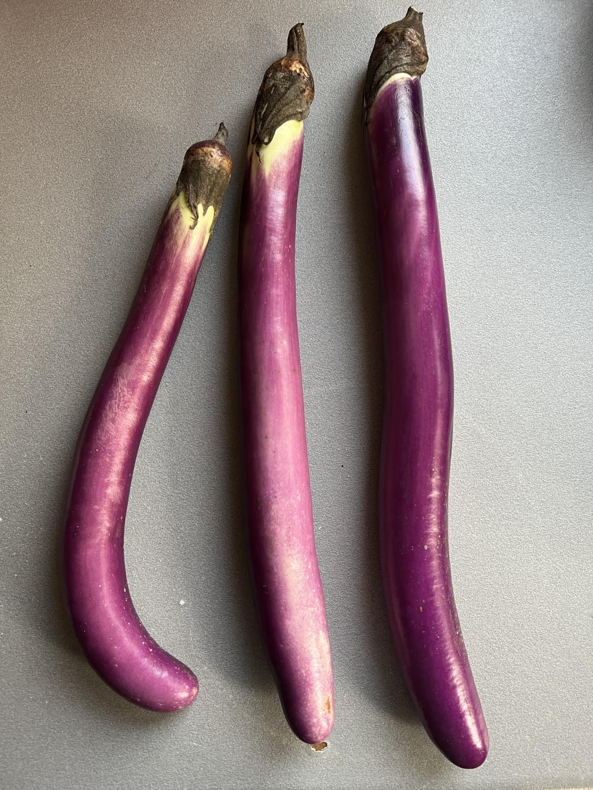 Jaapani baklažaan ehk pommu on pikk ja peenike, helelillat tooni. Siin retseptis vokitakse seda küüslaugu ja ingveriga.